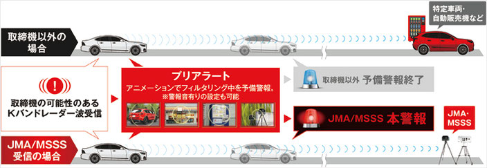 レーダー波を検知すると、ユピテル独自の「フィルタリング」機能で、最新のレーダー取締機(JMA-520/JMA-401/MSSS)かその他のレーダー波かを正確無比に識別し警報します。 さらに、特定車両が出す電波と自動販売機のレーダー波による誤警報も85%カットしました。
